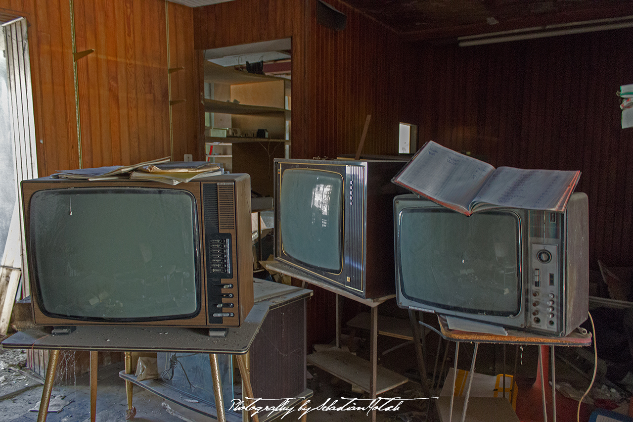 Part of the lower floor has been used as an electronics shop for some time. It looks like they sold and repaired radios and TV sets, some of which are still present on lovely old tables.