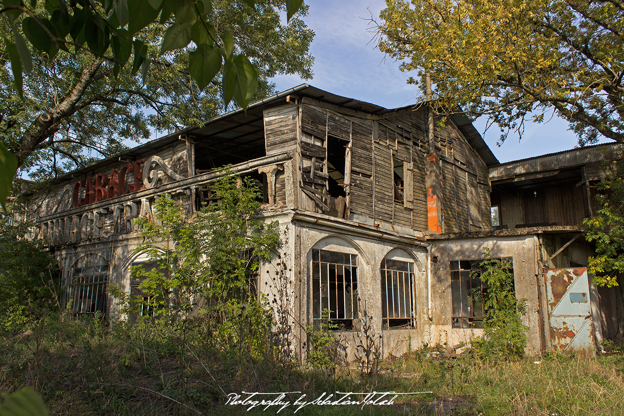 Upon closer inspection, the letters are not carved from wood, but poured concrete. The building seems abandoned and I take a sneak peek through the windows.