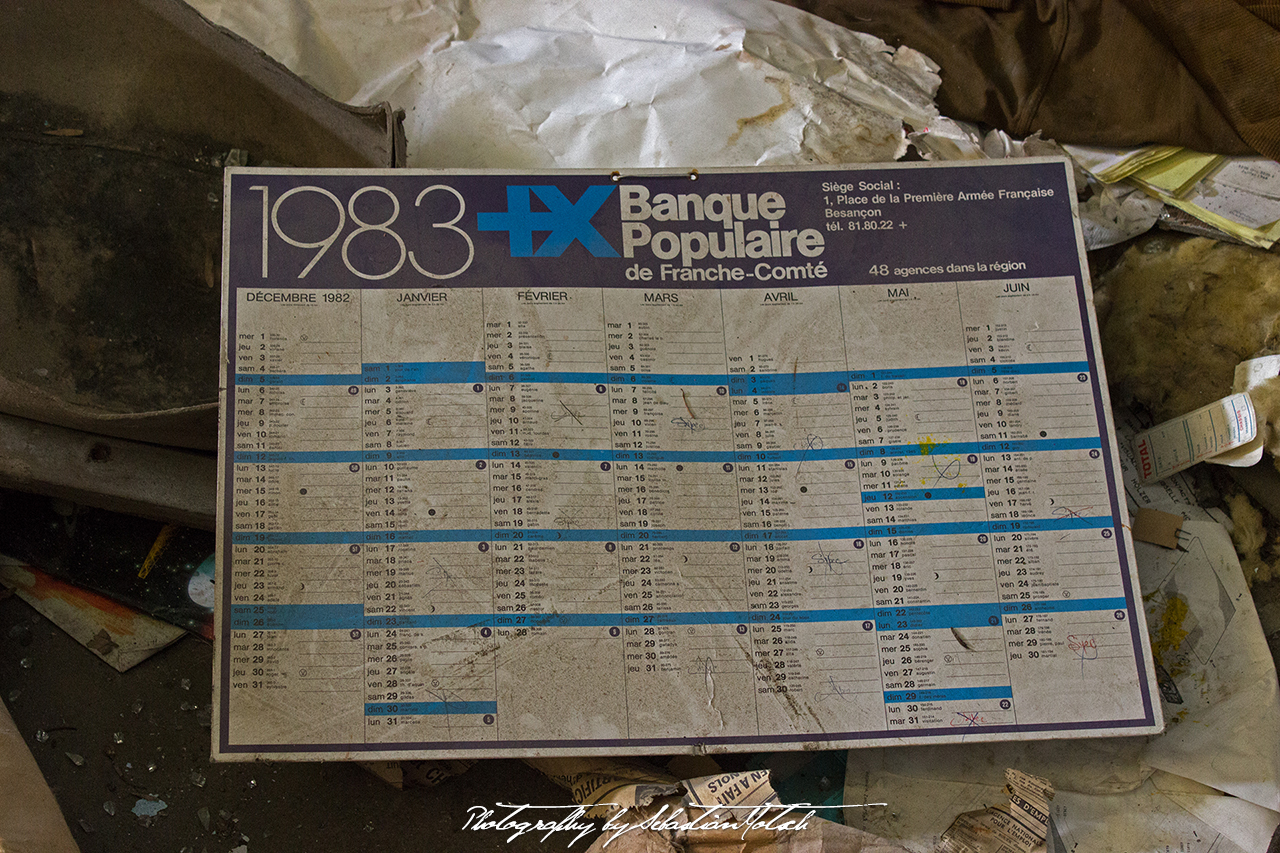 One of the doors is open and we step inside. It is considerably cooler and feels like we teleported into an analog past where it’s still 1983, according to the newest item we find: a Banque Populaire Franche-Comté wall calendar.