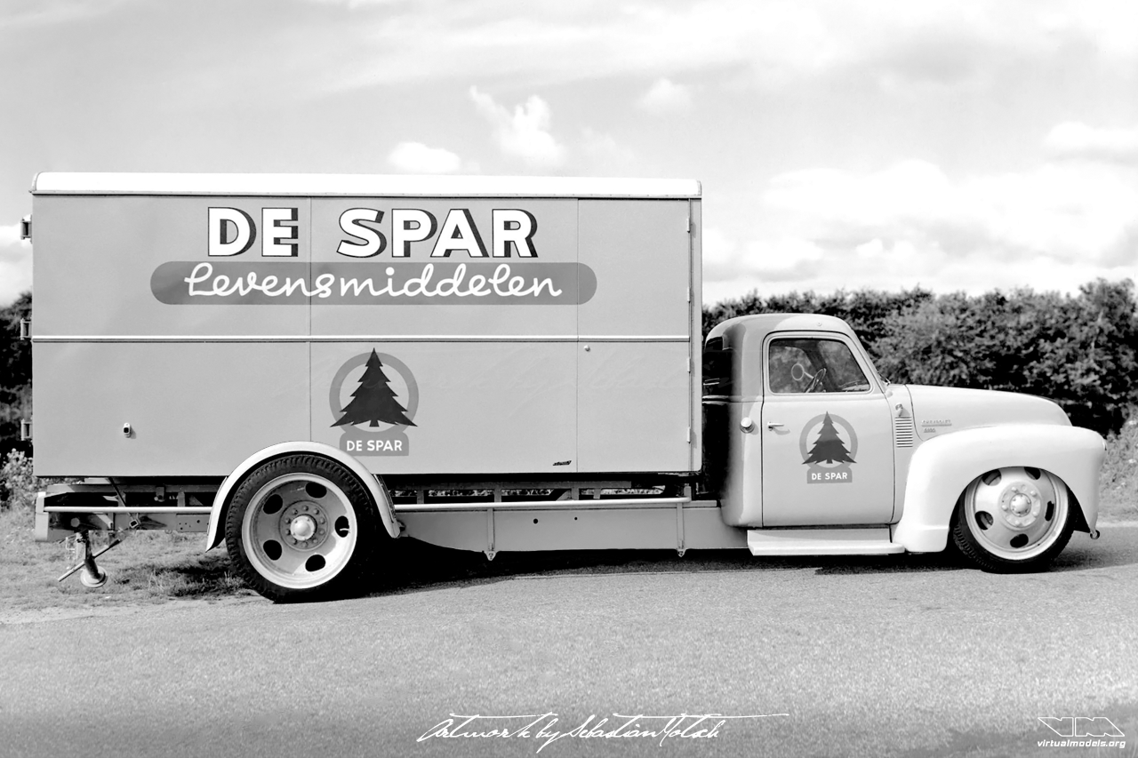 Sometimes a “quickie lunchbreak photoshop chop” is abandoned because of a small glitch that can’t be fixed at the time. In this case, I forgot the picture on my hard drive for a couple of years. With years more experience now, the then-unfixable glitch was remedied in a matter of not even 15 minutes and the chop finished. The 1949 Chevrolet 4400 Vrachtwagen met Renova afzetbaksysteem (SK-4403) was converted to a simple, straight forward hot rod concept that could have been built back then. Lowered by a couple of inches, it looks a lot better than the original truck while retaining its usability to deliver Levensmiddelen (groceries) to for the De Spar company in the Netherlands.